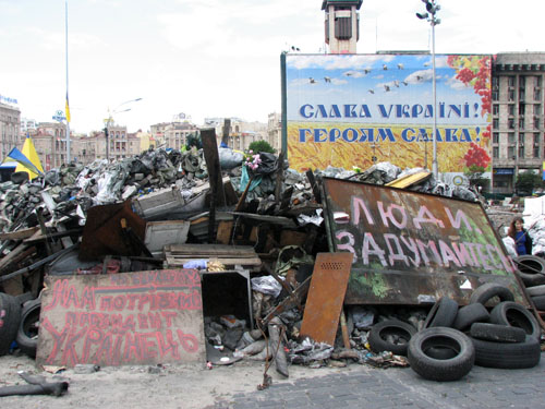 На месте и ёлка - пропитанная копотью и увешанная обтрепанными флагами и лозунгами. В местных газетах уже не раз мелькали статьи с заголовами в адрес новоизбранного городского головы Кличко: "Виталий, вынеси ёлку!"