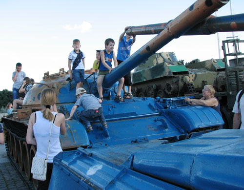 Те из танков, что поцелее, расцвечены в невероятный "камуфляж", напоминающий раскраску божьей коровки, создай ее Боженька синей. Очень похоже, что здесь постарались психилоги: так эта техника выглядит безопасней и "добрей". Все, что могло открыться, прищемить пальцы или поцарапать - аккуратно заварено. И потому на этих машинах буквально клубятся дети.