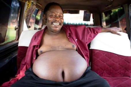 Ожирение в Уганде считается синонимом богатства и процветания. Тучные люди в отсталой стране пользуются уважением и почетом. Что же касается Моисея, который на минуточку весит 110 килограммов, то помимо излишнего веса природа и папа с мамой подарили ему и необычную форму живота.