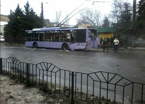 Утром 22 января в Ленинском районе Донецка, на остановке Боссе, снаряд попал в троллейбусную остановку. По предварительным данным, 13 человек погибли, десятки ранены.