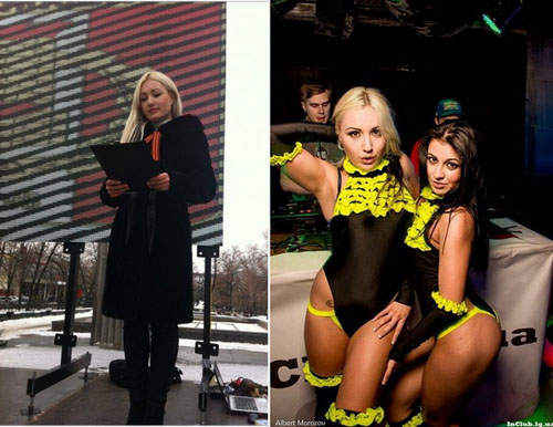 "Лидер сепаратистской организации "Луганская гвардия" и видная участница луганского антимайдана - стриптизерша Анастасия Пятерикова - 9 мая удивила жителей Луганска новым экзотическим нарядом. Правда, на этот раз она предстала перед луганчанами не в эротическом белье, а в форме подполковника советской авиации. При этом на груди у Пятериковой красовались награды ветерана войны.
