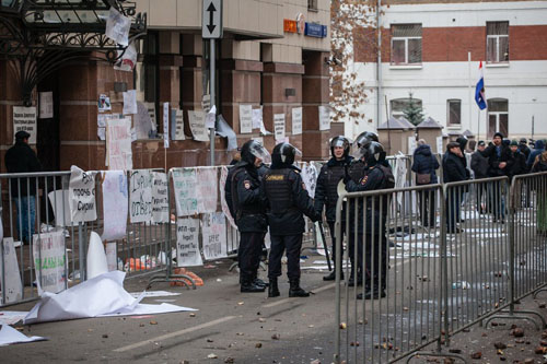 Сообщается, что сотрудники правоохранительных органов пытаются освободить подходы к дипломатическому ведомству, информация о задержанных отсутствует.