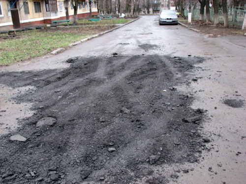 Жители краматорского микрорайона, расположенного между улицами Парковой, Ярослава Мудрого (бывш. XIX партсъезда) и Василя Стуса (бывш. Социалистическая) стали сегодня, 4 марта, свидетелями ремонта внутридворовых дорог по уникальной технологии. Называется эта технология "И так сойдет".