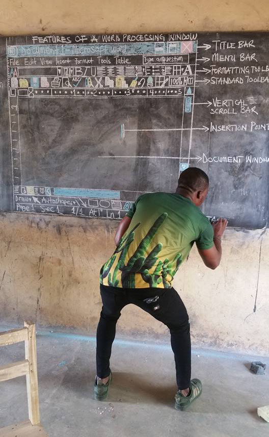 В англоязычном интернете стало вирусным фото со школьным учителем, который рассказывает ученикам о работе Microsoft Word. Но поскольку дело происходит в одной из школ Ганы, не оборудованной компьютерами, учитель нарисовал полную версию интерфейса программы цветными мелками на доске.
