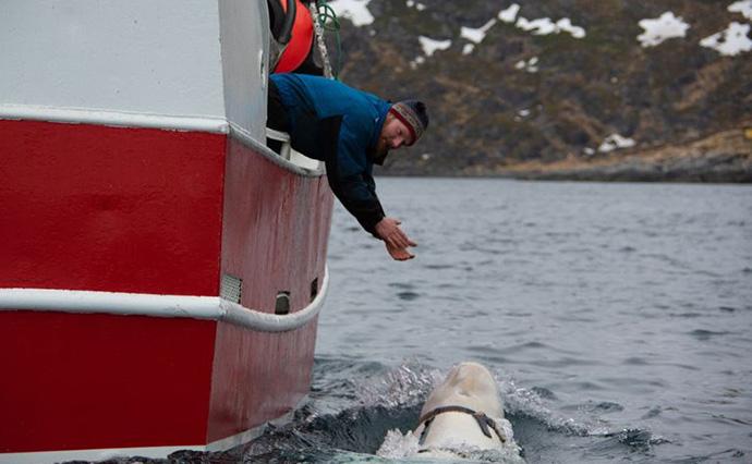 Один из рыбаков рассказал, что 25 апреля, когда он рыбачил около острова Ингойя вместе с отцом и братом, к их лодке подплыла белуха. На животном был ремень с обвесом и прикрепленной камерой GoPro. Ремень был очень туго затянут, и его удалось снять с кита только на следующий день.