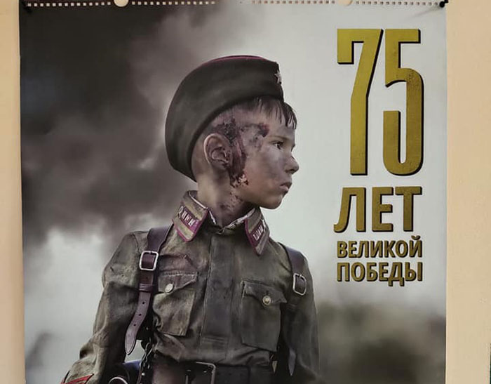 В одном из детских садов Москвы вывесили плакаты, на которых маленькие дети сфотографированы в форме и антураже времен Второй мировой войны.