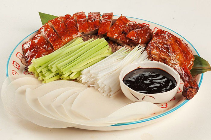 Один з головних символів китайської кухні, смажена у великій печі на повільному вогні вкрита сиропом качка з хрусткою тонкою шкіркою. Рецепт качки по-пекінськи з'явився ще XIV-го століття, він був розроблений придворним дієтологом спеціально для імператора династії Юань. Найкраще цю страву готують в спеціальних ресторанах, розташованих у столиці Китаю. Для приготування використовують спеціально вирощених птахів, крім того, правильна подача пекінської качки супроводжується традиційною церемонією розділення її на безліч дрібних шматочків. Подають качку, зазвичай, з тонкими млинцями, цибулею і бобовим соусом.