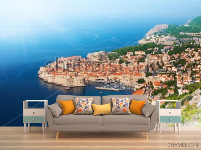 - Панорамные обои. Панорама уместна в интерьерах различных стилистических направлениях, среди которых лофт, хай-тек и урбанистический стиль. Изображение может содержать любой пейзаж, в который входит город или островная тематика.