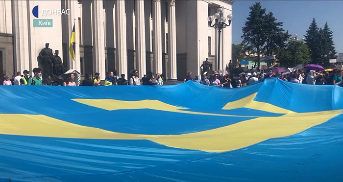 Крымскотатарский флаг размером 16 на 9 метров, сшитый в Краматорске, развернули в Киеве 15 июня, - сообщает «Суспільне».