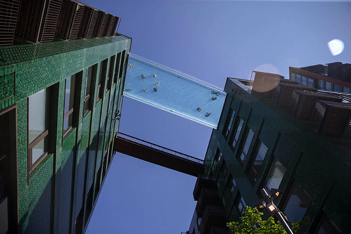 Бассейн, скорее, напоминает стеклянный мостик, связывающий крыши двух соседних зданий.