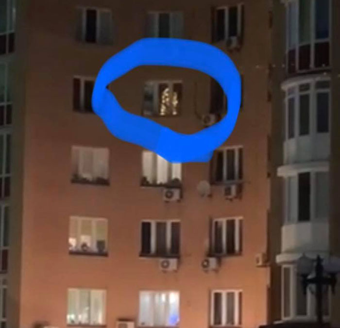 На снимке хорошо видно, что в окне квартиры на пятом этаже сияет включенная гирлянда на новогодней елке.