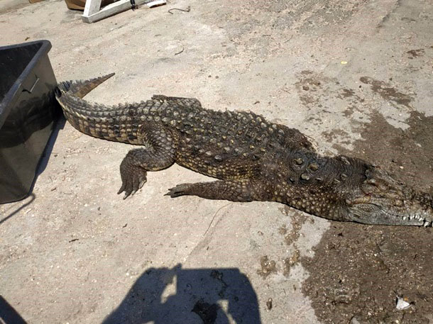 Пока местные власти решали, что делать с такой "находкой", у озера был выставлен полицейский пост. А сегодня, 5 августа, крокодила вытащили из воды, но уже был мертв.