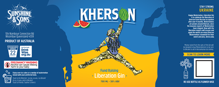 В Австралії на честь звільнення українською армією міста Херсона випустили лімітовану серію джину «Kherson». На пляшці зображений солдат ЗСУ, який тягнеться до кавуна.