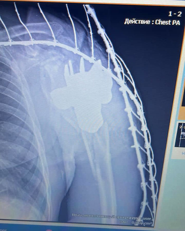 Про незвичайну ситуацію повідомило у Facebook Командування Медичних сил Збройних Сил України: при дообстеженні лікарями одного з прифронтових шпиталів, у тілі пораненого було виявлено сторонній предмет контури якого нагадували хвостовик міни.