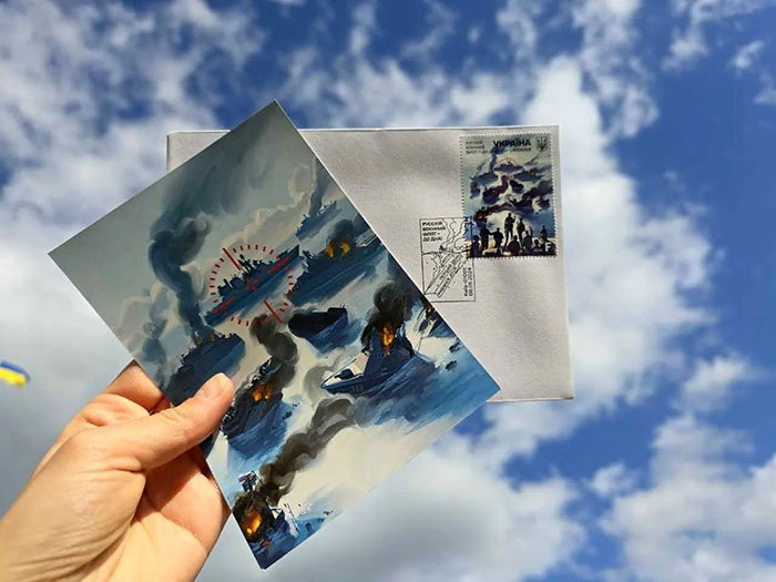 «Погасили нову поштову марку «русскій воєнний флот – до дна», яка продовжує серію поштових марок воєнного часу. Вони вже давно полюбились і нашим громадянам, і колекціонерам з усього світу, - наголосив Вадим Філашкін. - В центрі зображення — сторожовий фрегат «Адмірал Макаров», який знаходиться під прицілом. Раніше марка з зображенням підбитого крейсера «Москва» вже стала пророчою, тож сподіваюсь, що зовсім скоро у нашому Чорному морі стане ще менше ворожих кораблів.