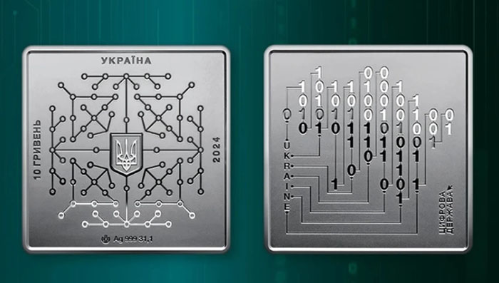 Пам’ятна монета "Цифрова держава" введена в обіг 13 грудня 2024 року. Вона має номінал 10 гривень, виготовлена у формі квадрата зі срібла 999 проби, маса дорогоцінного металу в чистоті – 31,1 г. Гурт монети – гладкий. Тираж – до 7 500 штук.