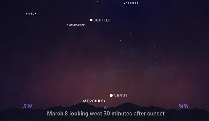 Найшвидшу планету Сонячної системи Меркурій можна буде побачити протягом перших 1,5 тижня березня. Планета з'являтиметься у вечірньому небі орієнтовано через 30 хвилин після заходу Сонця.