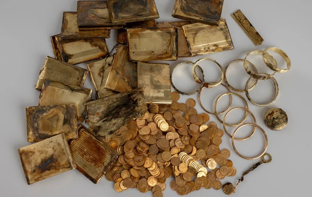 У лісовому схилі їм трапилася алюмінієва коробка, яка стирчала з кам’яної стіни. У середині були золоті браслети, пудрениця, гребінець, 17 портсигарів і майже 600 монет із золота.