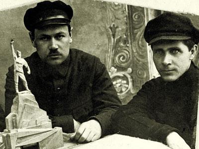 Иван Кавалеридзе (справа) и художник Соколов у макета памятника бахмутскому Артему.