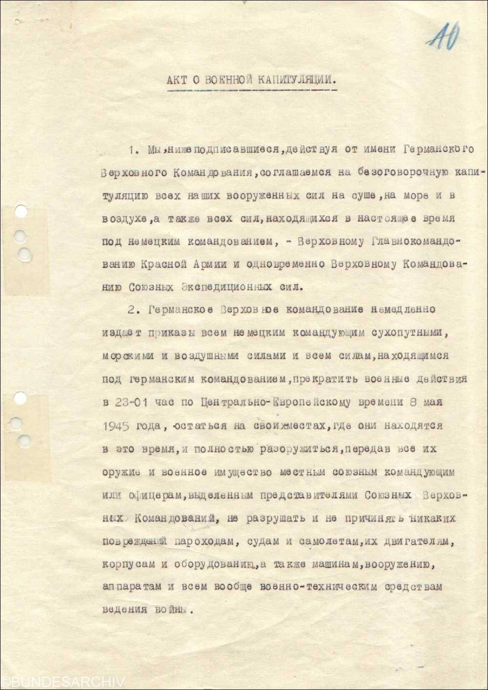 В 1945 году 8 мая в Карлсхорсте (предместье Берлина) в 22.43 по центрально-европейскому времени был подписан окончательный Акт о безоговорочной капитуляции нацистской Германии и её вооруженных сил. Данный акт именуется окончательным совсем не случайно, поскольку он, действительно, был не первым.