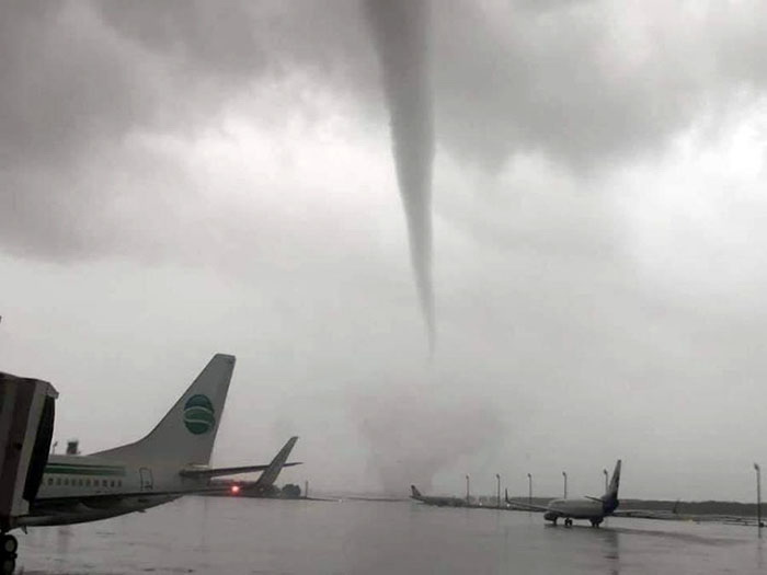 Сообщается, что сильно пострадал центр города, а также аэропорт: повреждены самолеты, лестницы. В результате опрокидывания автобуса в аэропорту пострадали 12 человек.