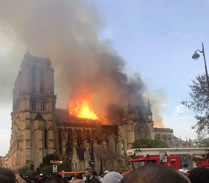 Пожар в знаменитом соборе Парижской Богоматери возник вечером 15 апреля. Уже полностью обрушились крыша, шпиль, установленный в XIX веке, колонны в нефе и часы. Кроме того, огонь перекинулся на левую башню собора. Из горящего Нотр-Дама успели вынесли Терновый венец, который был одет на Иисуса Христа назадолго до распятия.