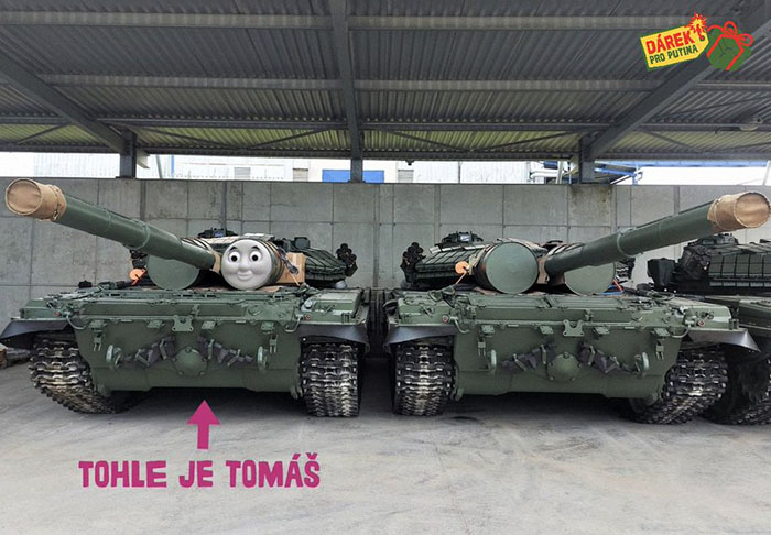 Чеська волонтерська ініціатива "Подарунок Путіну" зібрала 33 мільйони чеських крон або 1,33 мільйони доларів. На ці гроші було придбано модернізований танк T-72 AVANGER, що має власне ім’я "Томаш" та був взятий із запасів чеського Міноборони. Так Чехія стала першою в світі країною, де прості люди придбали танк для Збройних Сил України. Про це в своєму Twitter написав заступник міністра зовнішніх справ Євген Перебійніс.