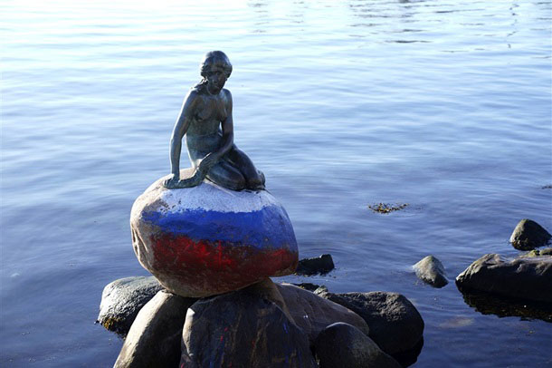 На скелю, на якій сидить статуя героїні з казки Ганса Крістіана Андерсена, у ніч на четвер, 2 березня, нанесли російський триколор, повідомляють місцеві ЗМІ.