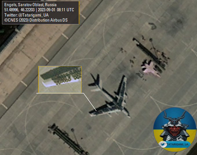 Супутникові знімки станом на ранок першого вересня демонструють наступне — що росіяни буквально накидали на один зі своїх стратегічних бомбардувальників Ту-95МС автомобільні шини.
