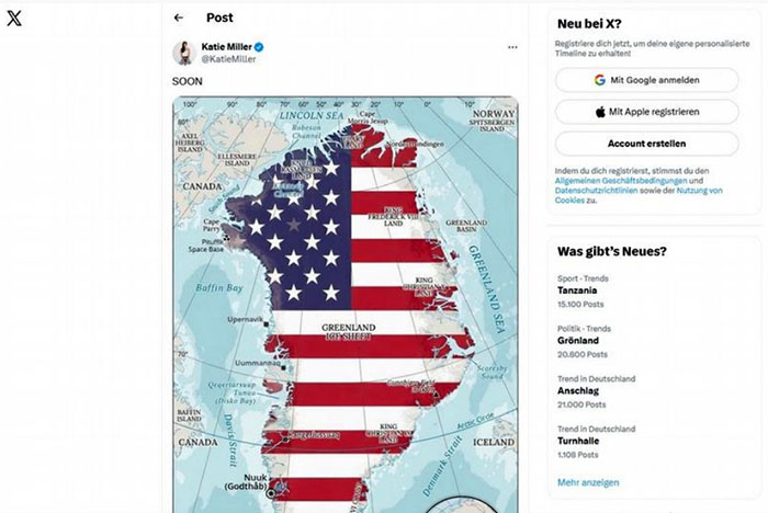 Зазначимо, 4 січня дружина радника президента США Дональда Трампа з внутрішньої безпеки Стівена Міллера Кеті опублікувала в соцмережі Х карту, де острів Гренландія зафарбовано в кольори американського прапора (на фото). Під мапою дружина радника Трампа залишила лаконічний підпис: "Скоро". Її дії викликали масштабне обурення як в Данії, так і безпосередньо в Гренландії.