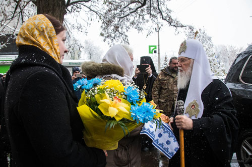 Патриарху вручили хлеб-соль и цветы, после чего гость пообщался с людьми. Святейший говорил о нынешней судьбе Украины в нелегкое время российской агрессии. По словам Патриарха, украинский народ сегодня стоИт за правду, и долгожданная победа уже близка.