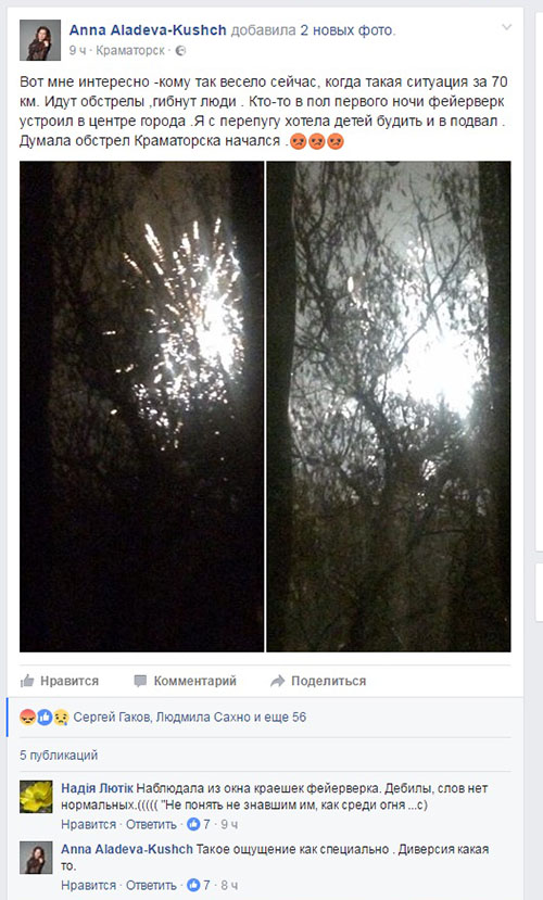 P.S. Считаю недопустимым и циничным факт празднования с запуском феейерверкив в прифронтовом городе во время обострения ситуации в Донецкой области и Украине".