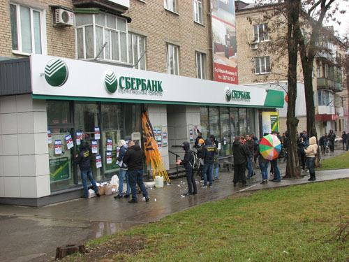 Сегодня, 20 марта, активисты Национального корпуса, как и обещали в субботу, вернулсь к зданию Сбербанка на улице Стуса в Краматорске.