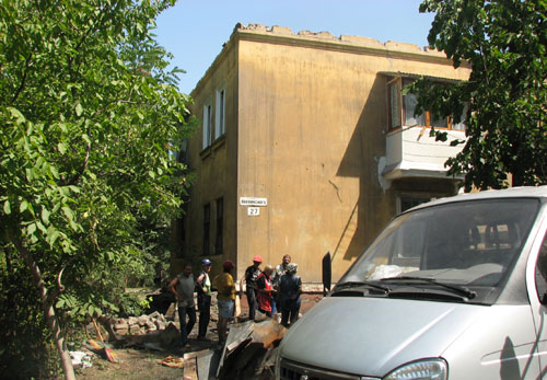Пострадавший дом сегодня представляет из себя печальное зрелище. Коммунальные службы, в клубах пыли и в саже, ликвидируют последствия пожара, снимая с крыши обгоревшие остатки конструкций.