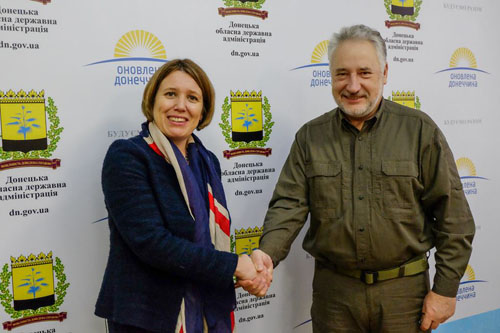 Губернатор также рассказал Послу, что, несмотря на то, что на территории области ведутся военные действия, часть Донбасса, контролируемая украинскими властями, активно развивается, рассказал о развитии сети опорных школ, открытии молодежных центров, строительстве спортивных площадок и полей с искусственным покрытием, программе развития малого бизнеса «Украинский донецкий куркуль».