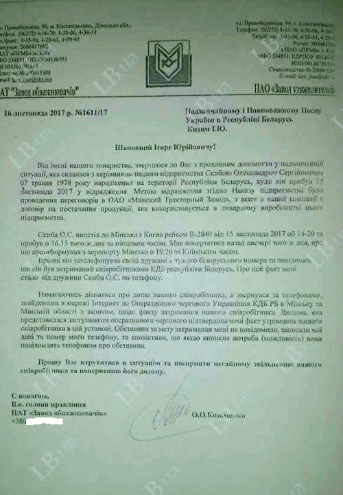 В обращении, подписанном и.о председателя правления этого завода О. Козьменко, утверждается, что директор ПАО "Завод утяжелителей" Скиба Александр Сергеевич (7 мая 1978 года рождения) прибыл в Минск 15 ноября в командировку на переговоры с ОАО "Минский тракторный завод", с которым в украинского предприятия существует договор о поставках продукции, которая используется в литейном производстве белорусского завода.