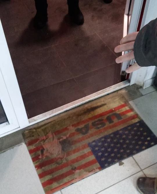 В Facebook сегодня активно обсуждается инцидент в одном из алкогольных маркетов Краматорска, где посетители обнаружили использование главных символов США в качестве коврика для ног.