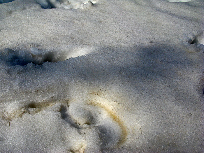Так, это очень заметно в районе кафе "Замок", в районе городка аттракционов и у озера. Причем бурая прослойка хорошо видна на продавивших снег следах.