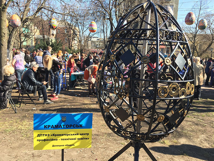 На выставке представлена и Донецкая область, которая привезла в Киев 15 пасхальных яиц, выкованных и сваренных из металла. Всё это - работы учащихся 12 высших профессиональных училищ региона: в том числе Краматорского высшего профессионального училища и Краматорского центра профессионально-технического образования.