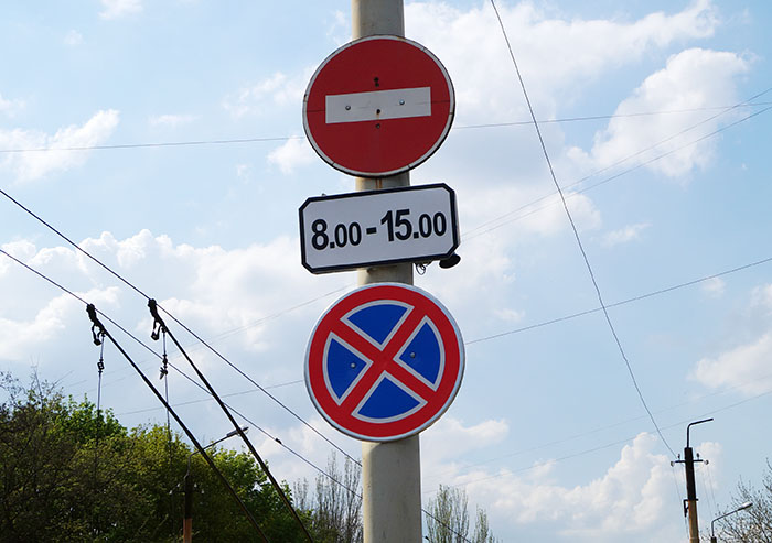 Первым автомобилем, который в 15:01 проехался под вчерашний запретительный знак, стал автомобиль полиции, за которым юрко двигался чей-то частный автомобиль. Замыкал тройку первых солидный черный джип.
