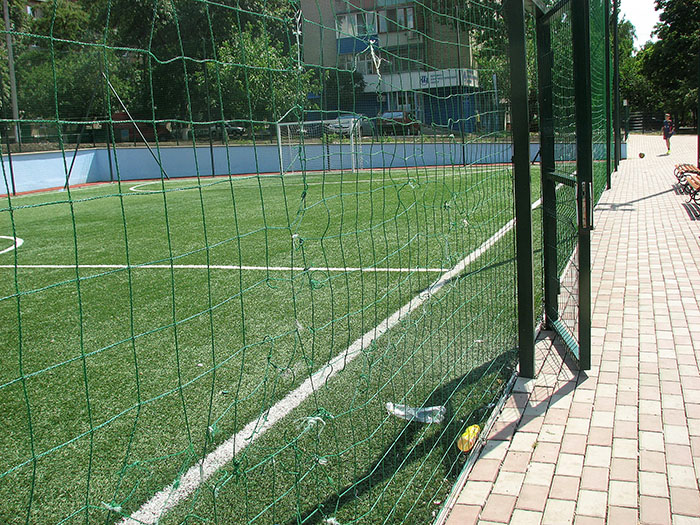 Особенно пострадало сеточное ограждение площадки для футбола: в полотне зияют дыры, которые пытаются закрывать, как могут. Учитывая характеристики капронового полотна ограждения, понимаешь, что кто-то для производства этих дыр очень и очень постарался...