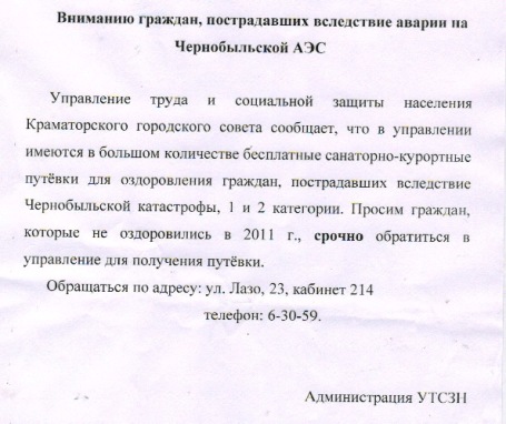 Оказывается, халява не всегда бывает востребованной. По информации начальника Краматорского управления труда и социальной защиты населения Наталии Чуковой, ее организация завалена бесплатными путевками для чернобыльцев на курорты, но ехать и лечиться по ним никто не хочет!
