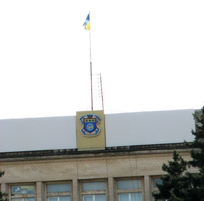 В субботу, 14 апреля, здание горисполкома Краматорска украсилось большим гербом города. Новый символ разместился как раз на том месте, где когда-то виднелись лепные серп и молот времен СССР.