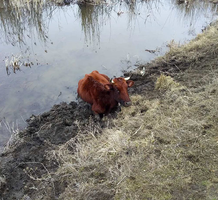 Необычный вызов поступил сегодня, 12 марта, в "Службу спасения 101" Краматорска: жители поселка Софиевка сообщили, что в реке Бычок застряла корова, и самостоятельно выбраться из грязи она не может.