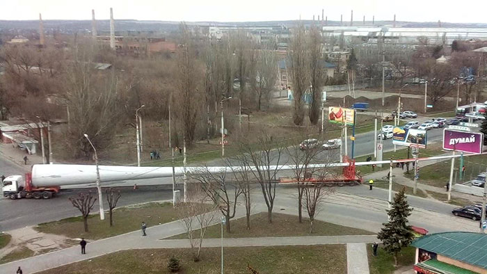 Жительница Краматорска Елена Комиссарова разместила в Facebook впечатляющие фото транспортировки по городу первой лопасти к монтируемой ветроэнергетической установке. Размеры элемента пораджают воображение.