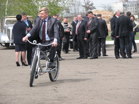 Выяснилось также, что, оказывается, в последнее время мастера фабрики «СамоходЪ» заинтересовались темой создания собственных байк-велосипедов. На одном из них лихо прокатился голова Добропольской райадминистрации Николай Гапыч.
