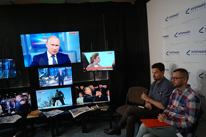После этого, посетитель «Пропагандариума» попадает в другой кабинет, также увешанный мониторами и наглядными примерами с разбором российских фейковых сообщений о событиях в Украине. И, после небольшой просветительской лекции, уже на выходе, "пациента" ждет "медсестра", которая с помощью небольшого опроса на планшете, сообщает информацию о степени выздоровления "больного".