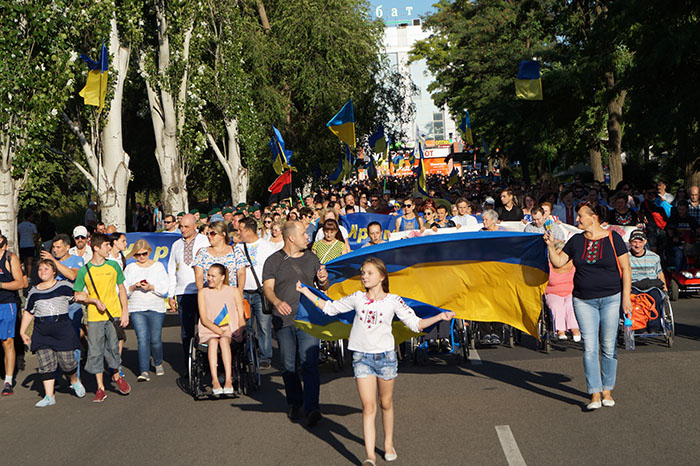 На центральной площади Краматорска участников акции ждала сцена, с которой к горожанам со словами поздравления обратились новоназначенный глава Донецкой облгосадминистрации Павел Кириленко, мэр города Андрей Панков, генерал Вооруженных сил Украины, заместитель секретаря Совета национальной безопасности и обороны Украины Сергей Кривонос и другие официальные лица.