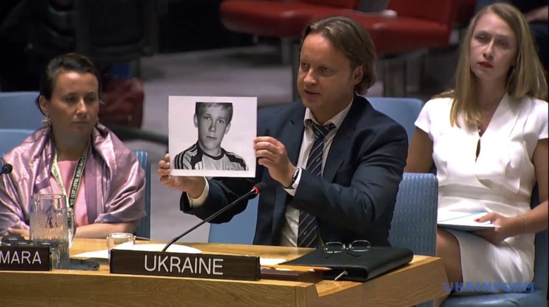 «Это - шестнадцатилетний Степан Чубенко, школьник из Краматорска Донецкой области. Он был голкипером первой команды молодежной лиги, активистом и одним из организаторов местного КВН», - обратился Витренко к присутствующим членам Совбеза ООН, держа в руках фотографию Степана Чубенко.