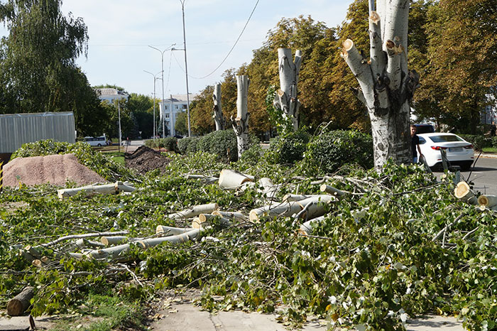 Сегодня, 27 августа, пилы дровосеков основательно прошлись по целому ряду тополей, расположенных на обочине дороги, ведущей от улицы Стуса к центральной площади города. Вот такой вид всё это имеет сейчас, пока спиленные деревья и ветки не убрали с глаз подальше.